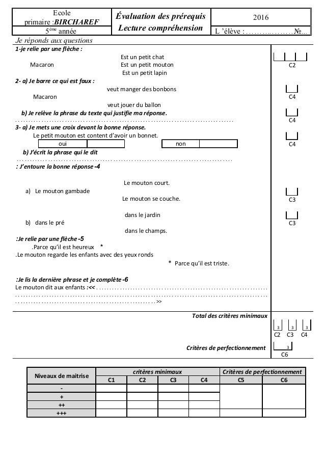 Evaluation Lecture Des Prerequis Ecture Comp 4eme